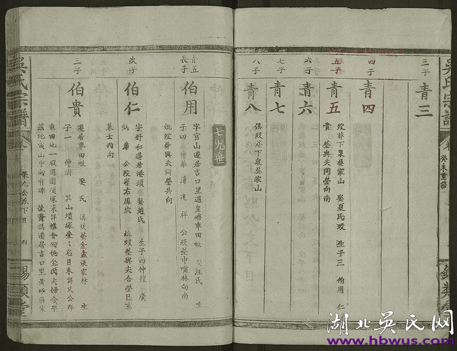 79世伯用居吉口里遇皇塘车田畈,伯仁迁居港头,伯贵由车田畈迁居吉口里黄沙吴家桥。伯用生仲华、仲海、仲达(无出)、仲祥(无出),仲华生兴嶐,仲海生兴仲;伯仁至孙辈兴寿、兴禄,之后无传;伯贵生仲澍,仲澍生兴道;兴嶐生友亮、兴仲生友善、友敬(无传);兴道生友翥。自此派分三房,伯用公之后分友亮、友善两房伯贵公之后友翥一房。